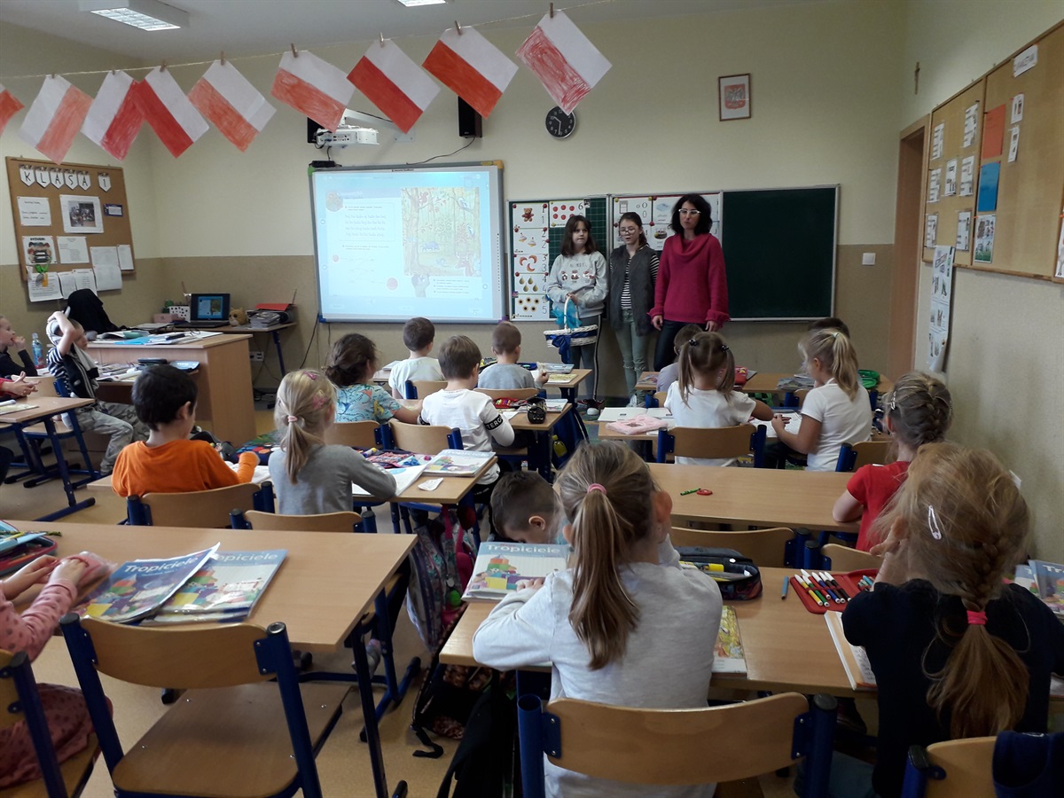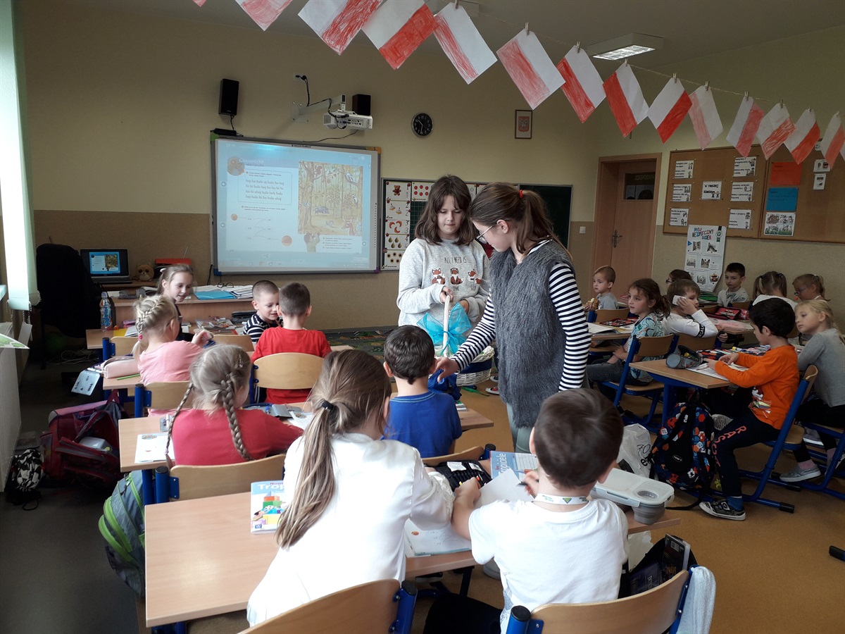 W czwartek 7 listopada uczennice Ala Karlińska i Wiktoria Jezierska odwiedziły swoich młodszych kolegów by wręczyć im drobne podarunki. Dziewczynki chciały osobiście przywitać pierwszaków w gronie uczniów naszej szkoły i przygotowały dla nich czekoladowe smakołyki ładnie zapakowane i ozdobione. Ala i Wiktoria zostały ciepło przyjęte przez kolegów i koleżanki, a cukierki szybko się zjadły. Pani Małgosia Cukiernik wraz ze swoją liczną gromadką serdecznie podziękowała uczennicom za tak wyjątkową inicjatywę. BRAWO DZIEWCZYNKI!!!