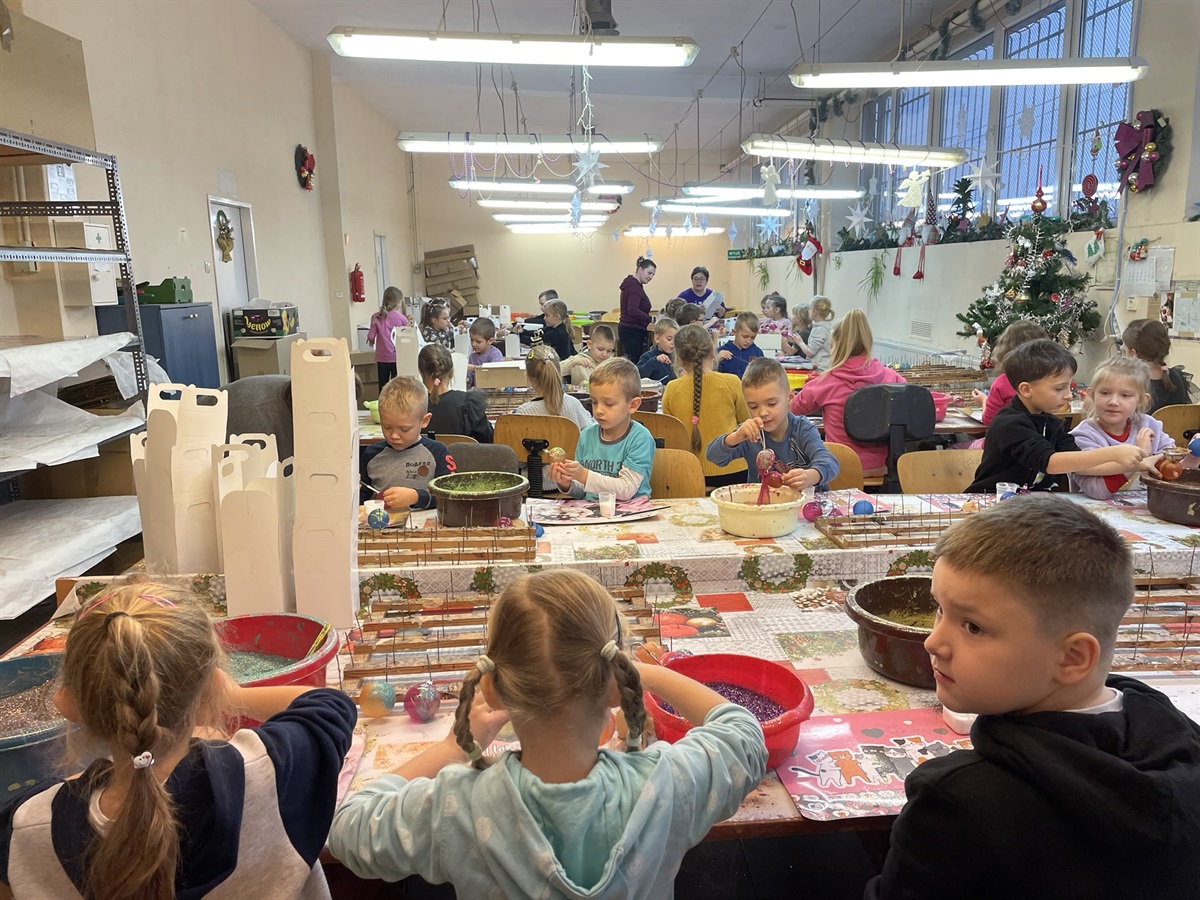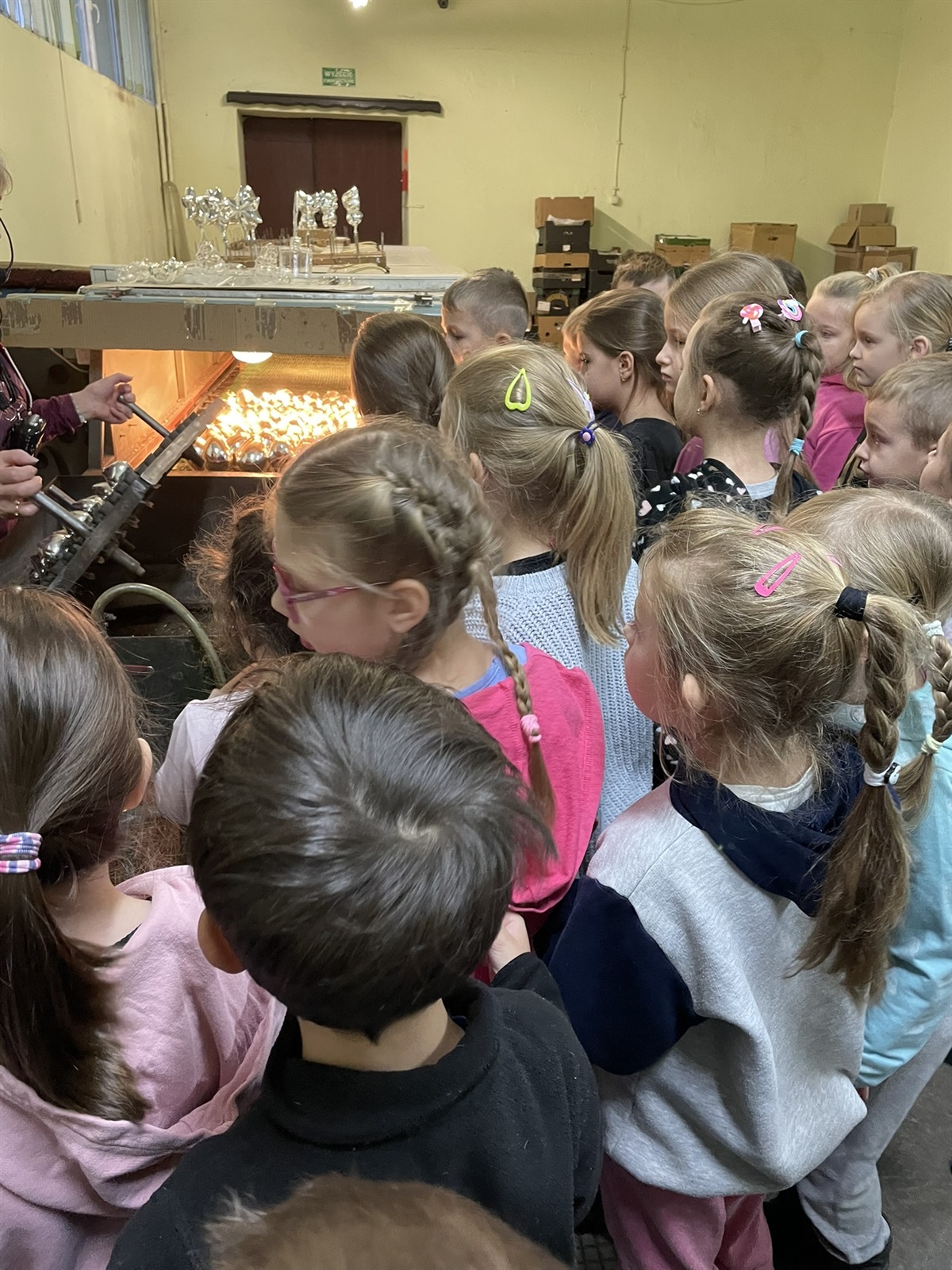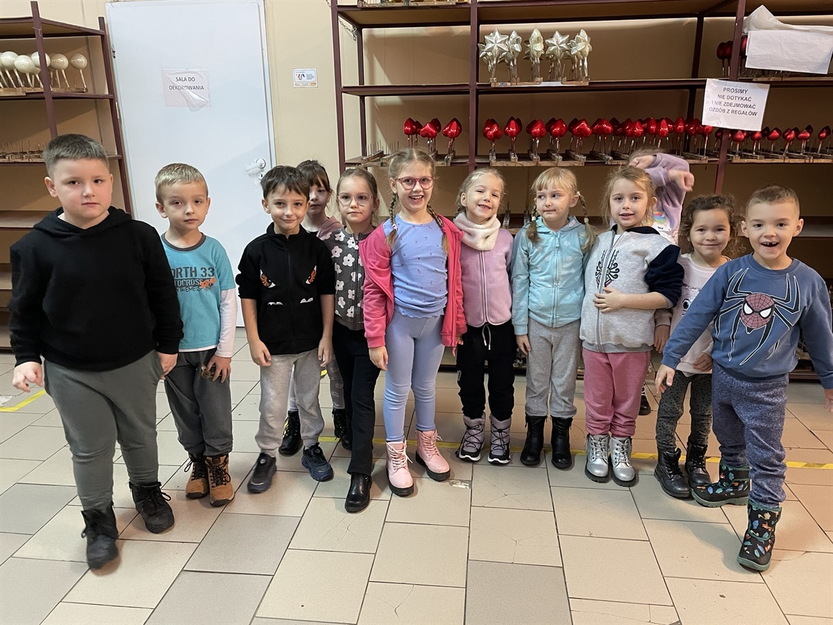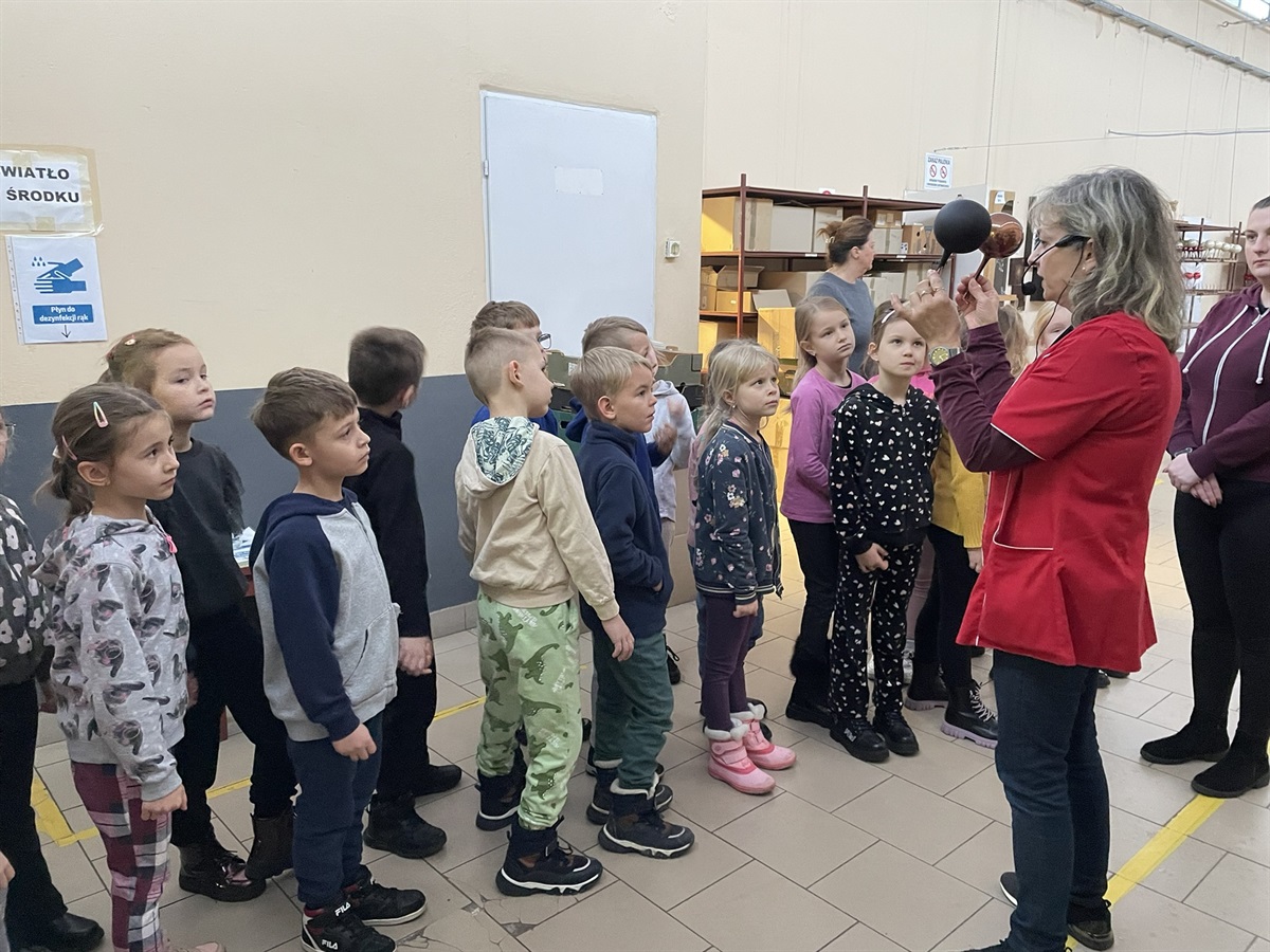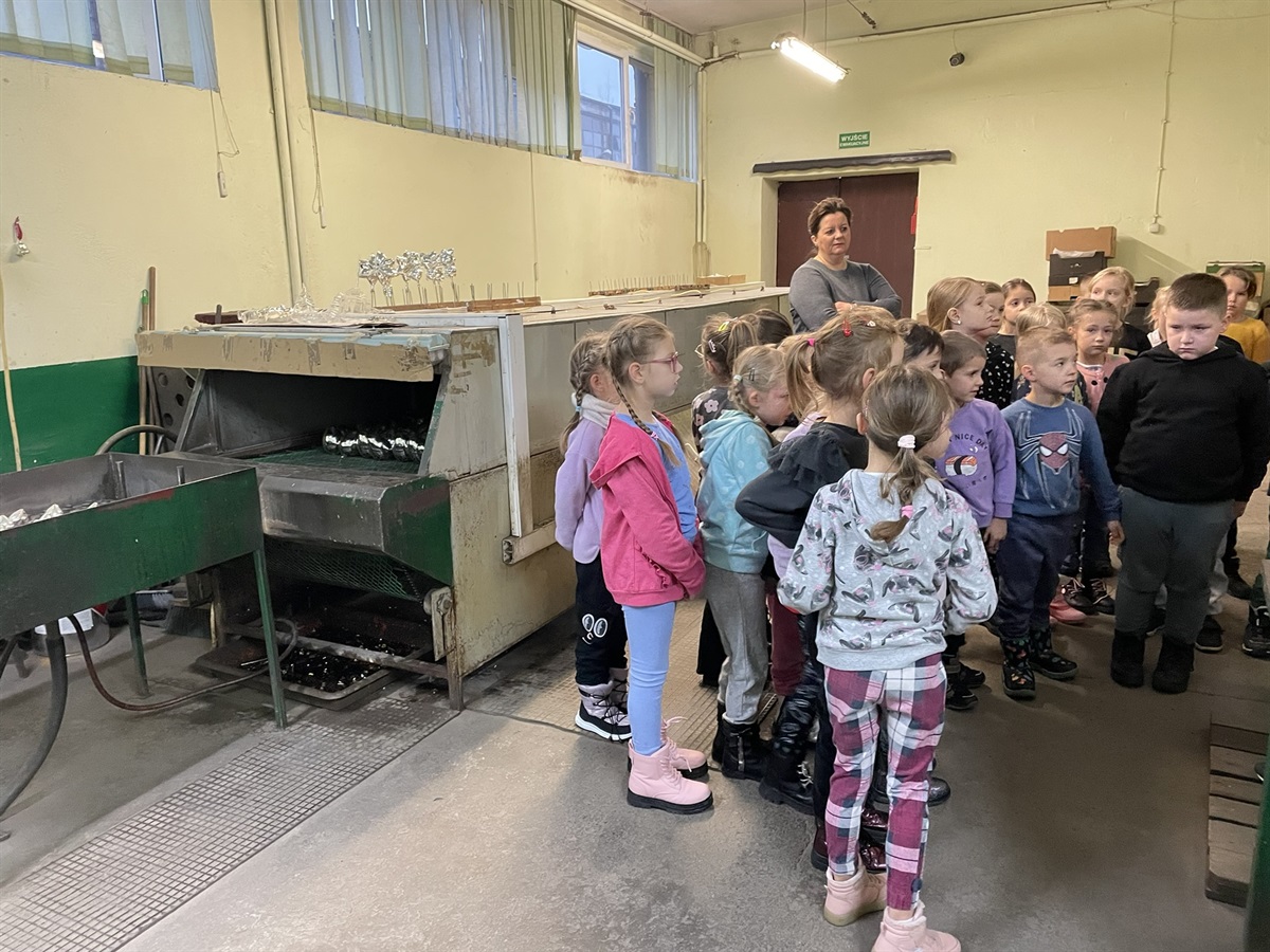 Natomiast w czwartek 28 listopada 2024 r. oddział przedszkolny wraz z klasą I wybrali się do najsłynniejszej w Polsce fabryki bombek - Szkło Dekor. Tam krok po kroku dzieci zostały wtajemniczone w proces powstawania szklanych ozdób. Bombki są najpierw wydmuchiwane i uzyskują odpowiednie formy, następnie trafiają do srebrzalni. Zanim wielka maszyna zacznie je potrząsać, strzykawką otrzymują do środka glukozę oraz azotan srebra, który nadaje bombką srebrnego koloru. Panie dekoratorki obdarzone imponującym talentem, wymalowują na świątecznych ozdobach przepiękne wzory. Podczas pobytu w fabryce bombek mogliśmy sami zamienić się w dekoratorów i ozdobić po cztery bombki, które potem z uśmiechem na ustach zabraliśmy do domów. Fabryka bombek była skarbnicą ogromnej wiedzy o zawodach