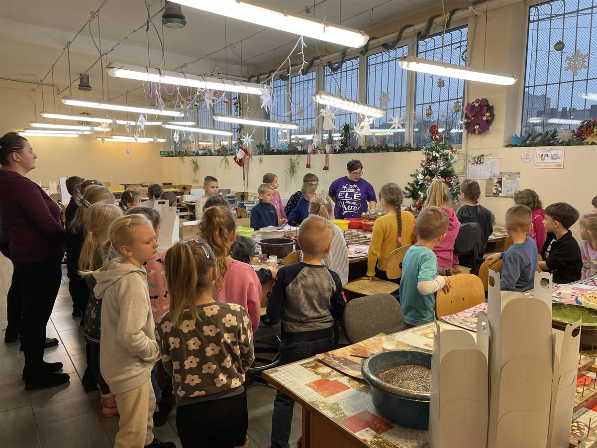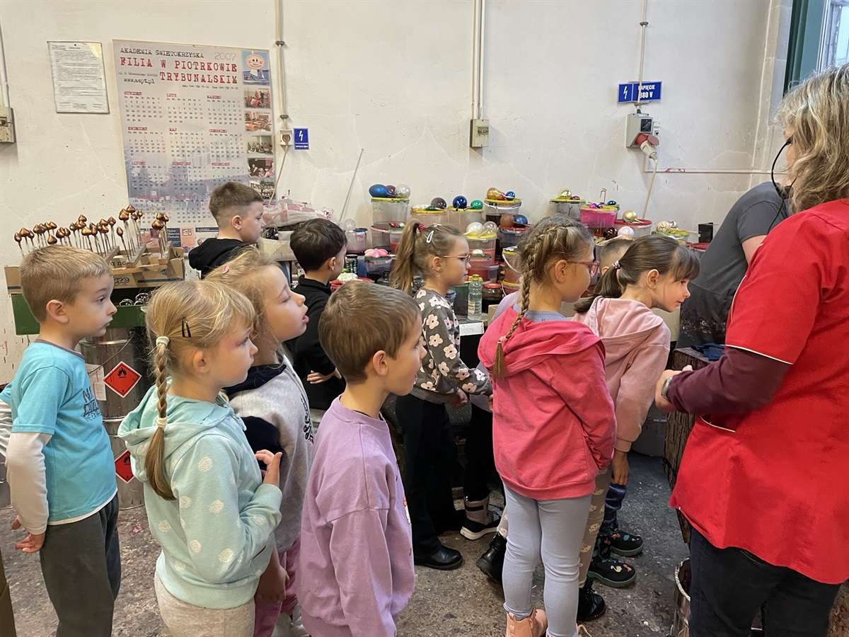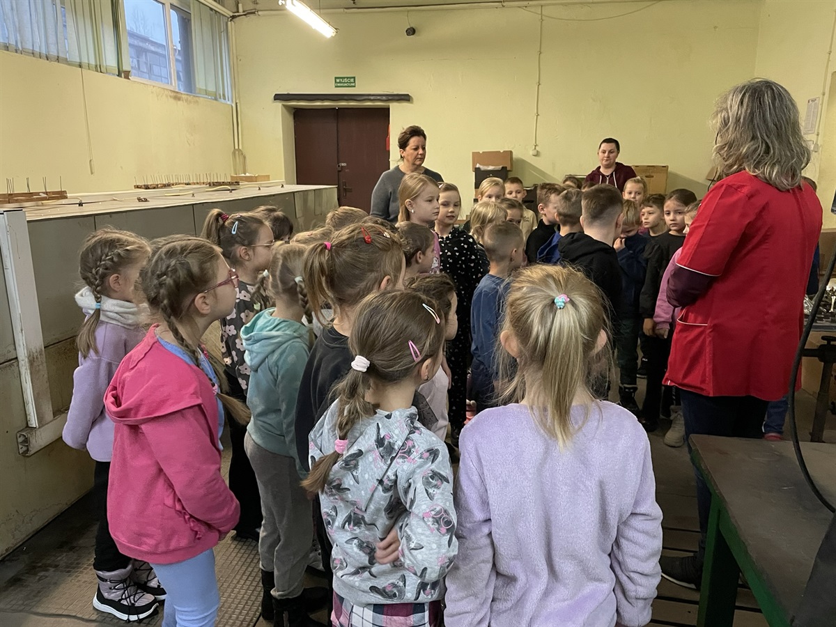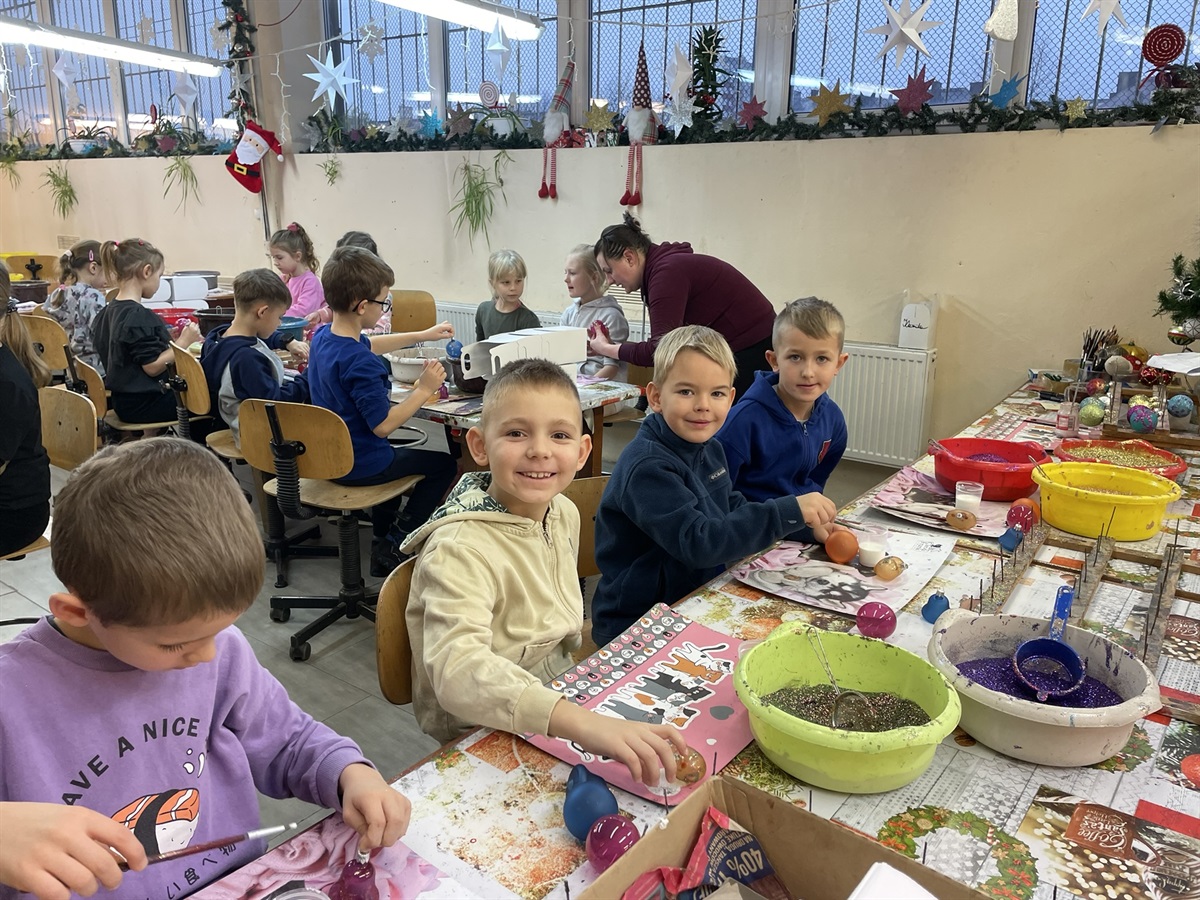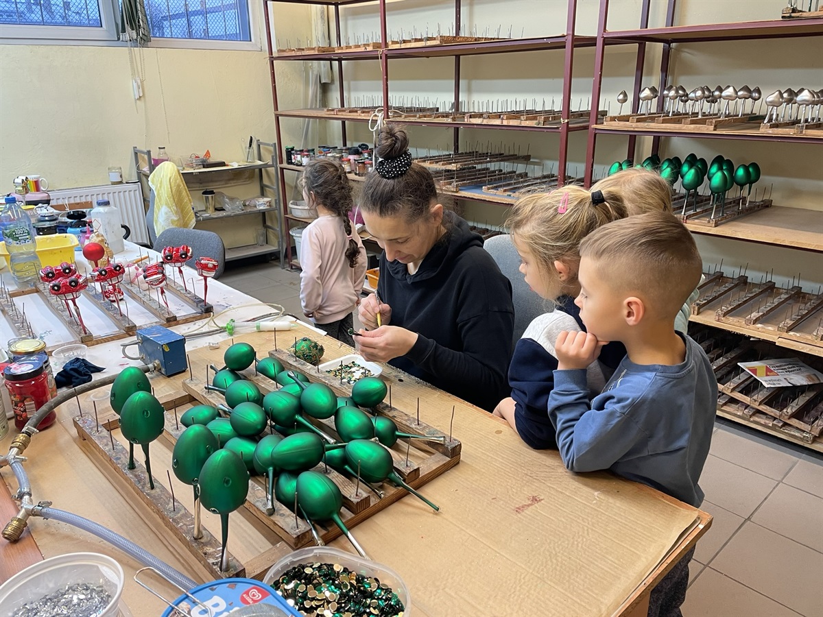Natomiast w czwartek 28 listopada 2024 r. oddział przedszkolny wraz z klasą I wybrali się do najsłynniejszej w Polsce fabryki bombek - Szkło Dekor. Tam krok po kroku dzieci zostały wtajemniczone w proces powstawania szklanych ozdób. Bombki są najpierw wydmuchiwane i uzyskują odpowiednie formy, następnie trafiają do srebrzalni. Zanim wielka maszyna zacznie je potrząsać, strzykawką otrzymują do środka glukozę oraz azotan srebra, który nadaje bombką srebrnego koloru. Panie dekoratorki obdarzone imponującym talentem, wymalowują na świątecznych ozdobach przepiękne wzory. Podczas pobytu w fabryce bombek mogliśmy sami zamienić się w dekoratorów i ozdobić po cztery bombki, które potem z uśmiechem na ustach zabraliśmy do domów. Fabryka bombek była skarbnicą ogromnej wiedzy o zawodach