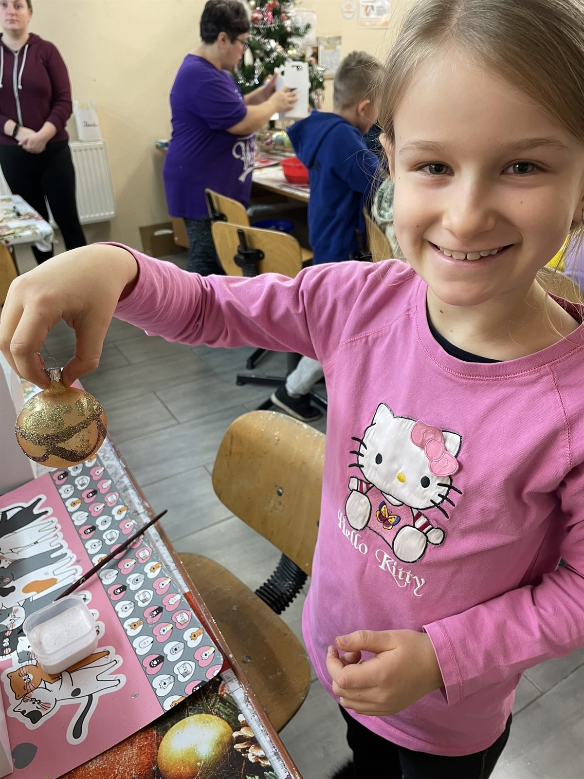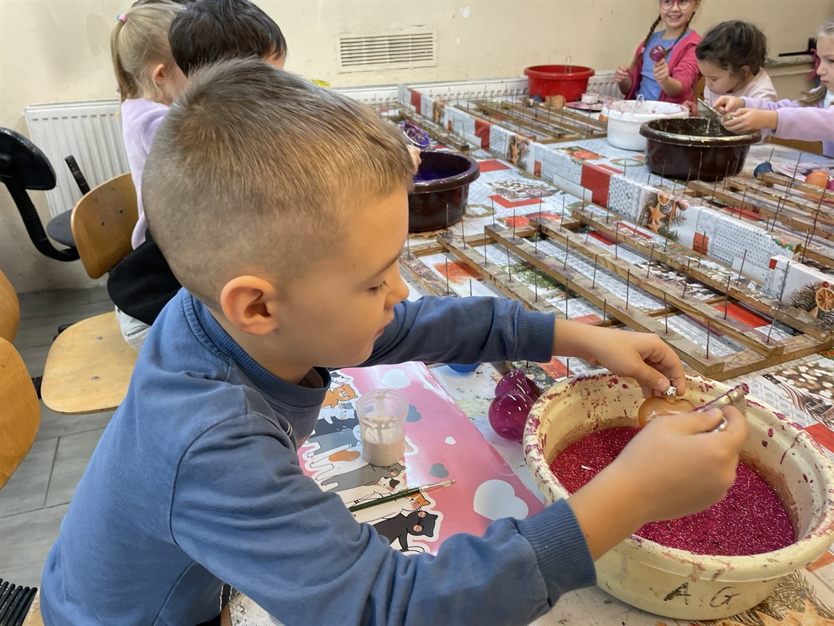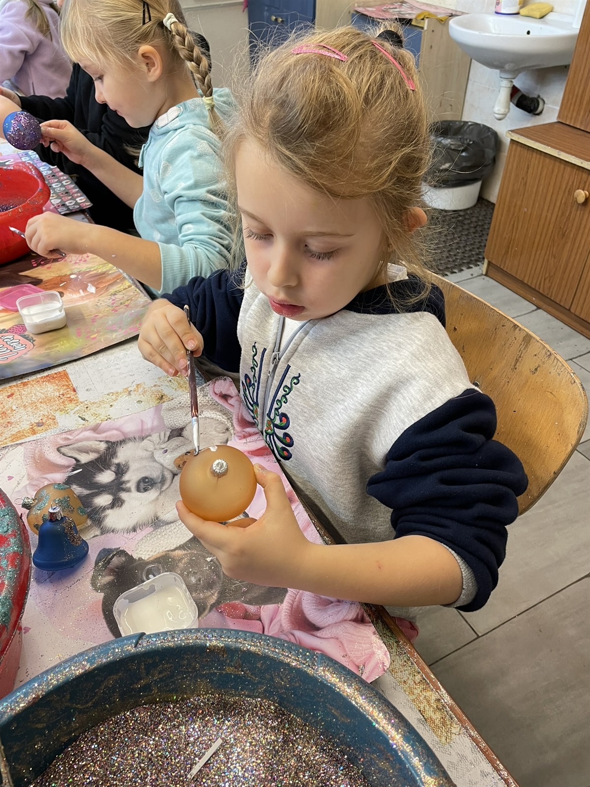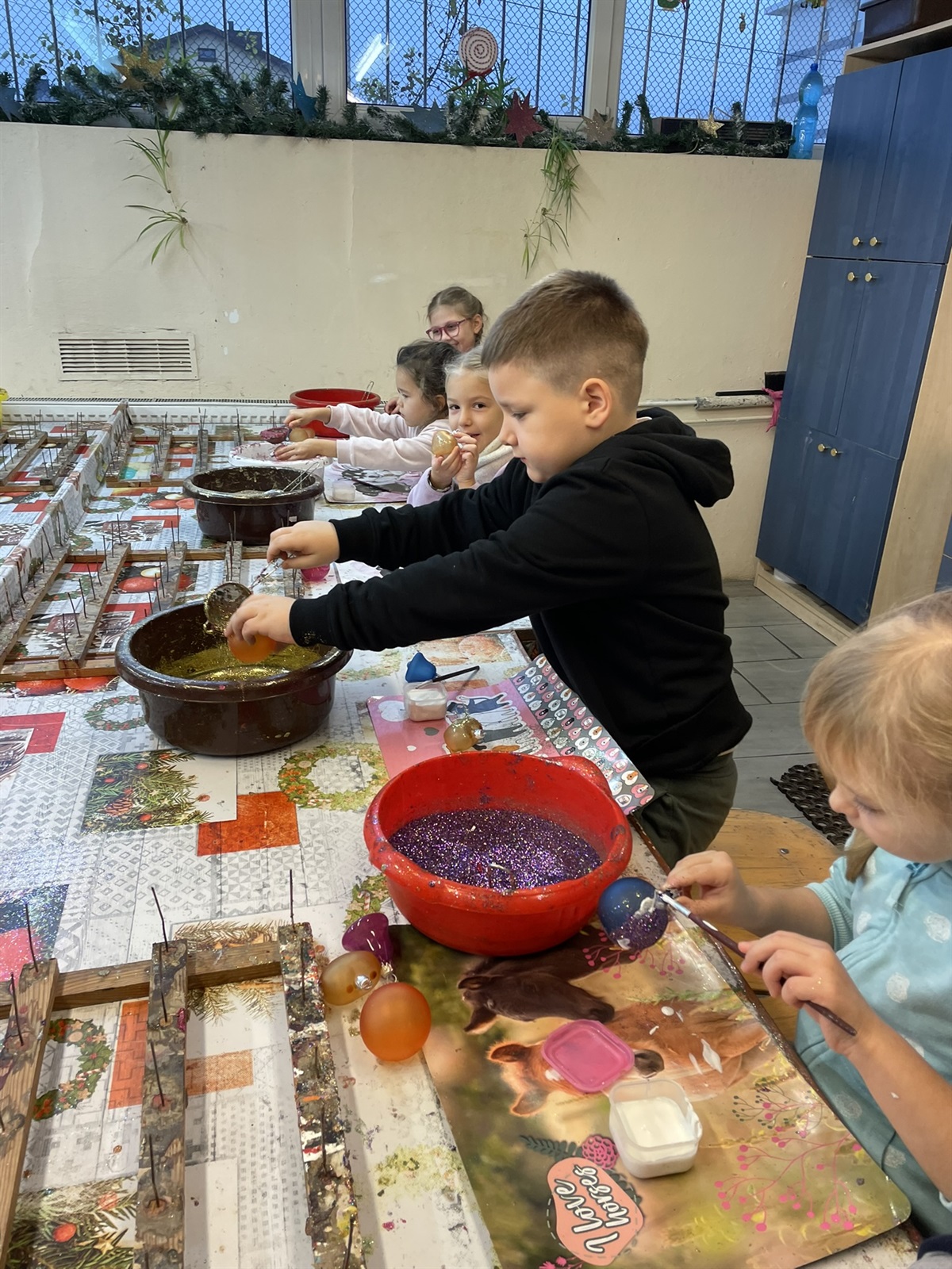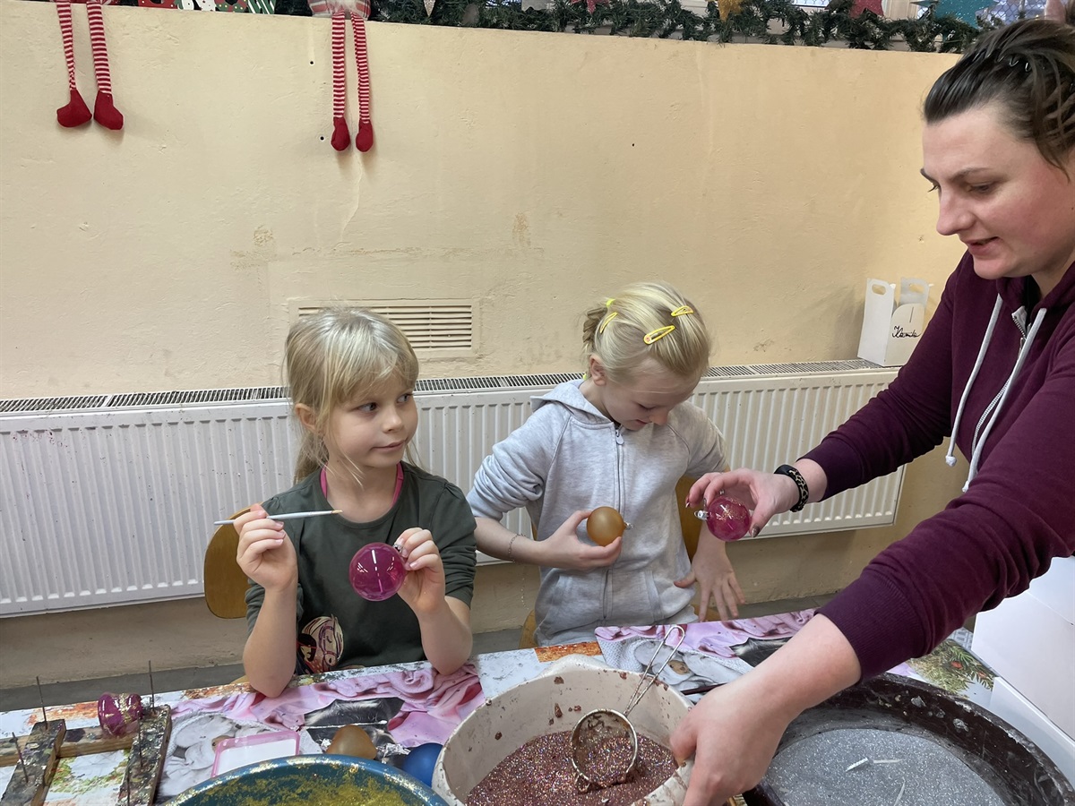 Natomiast w czwartek 28 listopada 2024 r. oddział przedszkolny wraz z klasą I wybrali się do najsłynniejszej w Polsce fabryki bombek - Szkło Dekor. Tam krok po kroku dzieci zostały wtajemniczone w proces powstawania szklanych ozdób. Bombki są najpierw wydmuchiwane i uzyskują odpowiednie formy, następnie trafiają do srebrzalni. Zanim wielka maszyna zacznie je potrząsać, strzykawką otrzymują do środka glukozę oraz azotan srebra, który nadaje bombką srebrnego koloru. Panie dekoratorki obdarzone imponującym talentem, wymalowują na świątecznych ozdobach przepiękne wzory. Podczas pobytu w fabryce bombek mogliśmy sami zamienić się w dekoratorów i ozdobić po cztery bombki, które potem z uśmiechem na ustach zabraliśmy do domów. Fabryka bombek była skarbnicą ogromnej wiedzy o zawodach