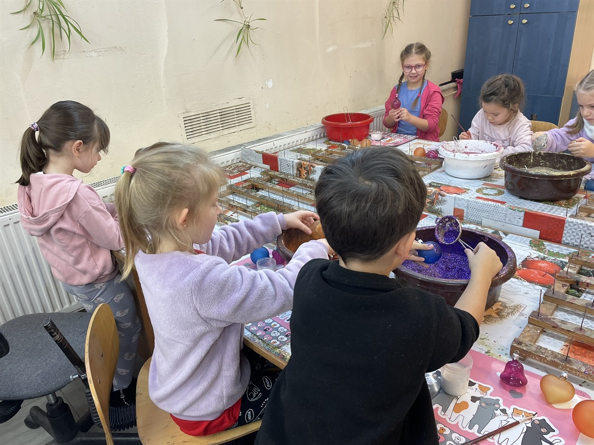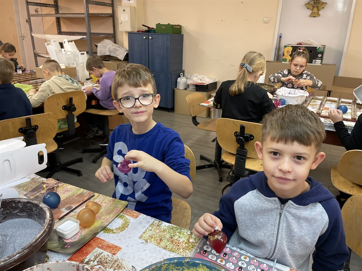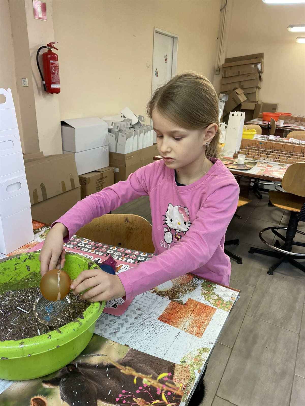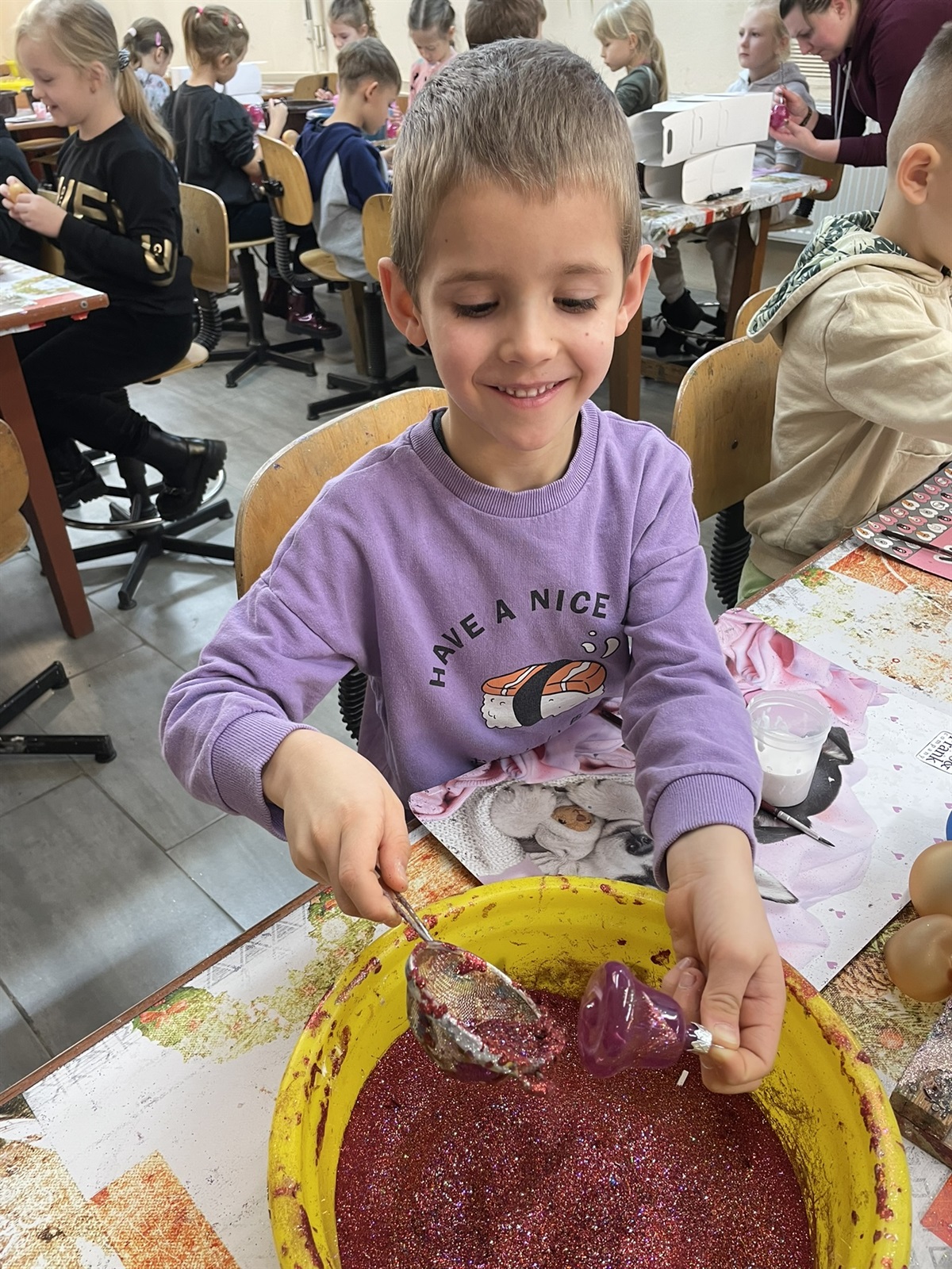 Natomiast w czwartek 28 listopada 2024 r. oddział przedszkolny wraz z klasą I wybrali się do najsłynniejszej w Polsce fabryki bombek - Szkło Dekor. Tam krok po kroku dzieci zostały wtajemniczone w proces powstawania szklanych ozdób. Bombki są najpierw wydmuchiwane i uzyskują odpowiednie formy, następnie trafiają do srebrzalni. Zanim wielka maszyna zacznie je potrząsać, strzykawką otrzymują do środka glukozę oraz azotan srebra, który nadaje bombką srebrnego koloru. Panie dekoratorki obdarzone imponującym talentem, wymalowują na świątecznych ozdobach przepiękne wzory. Podczas pobytu w fabryce bombek mogliśmy sami zamienić się w dekoratorów i ozdobić po cztery bombki, które potem z uśmiechem na ustach zabraliśmy do domów. Fabryka bombek była skarbnicą ogromnej wiedzy o zawodach