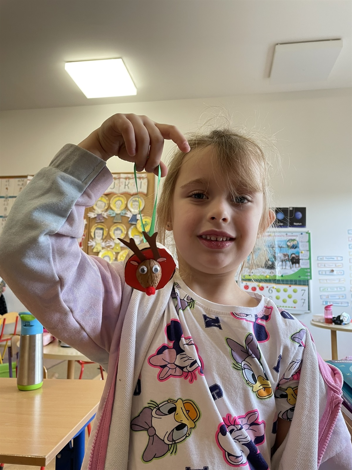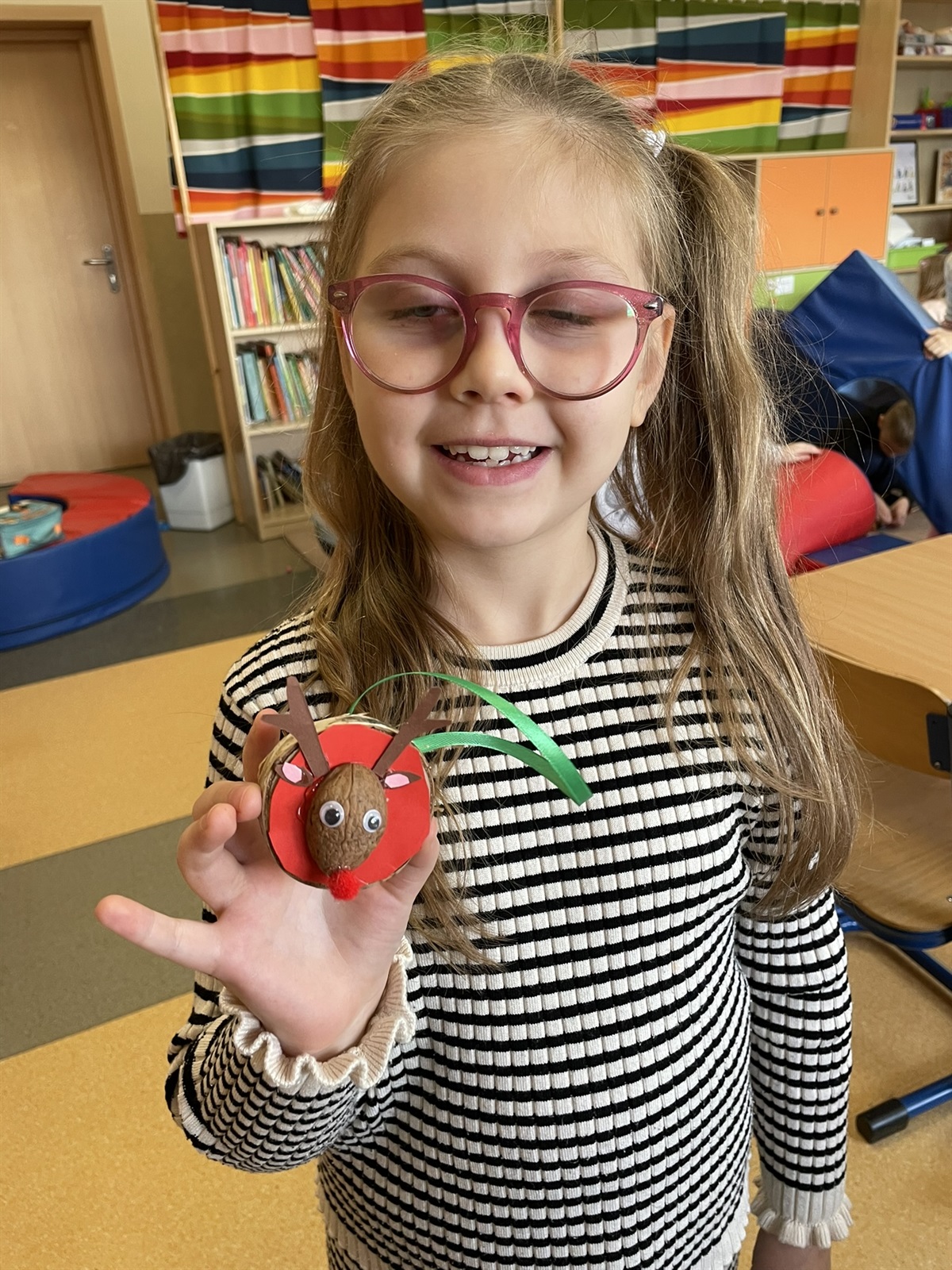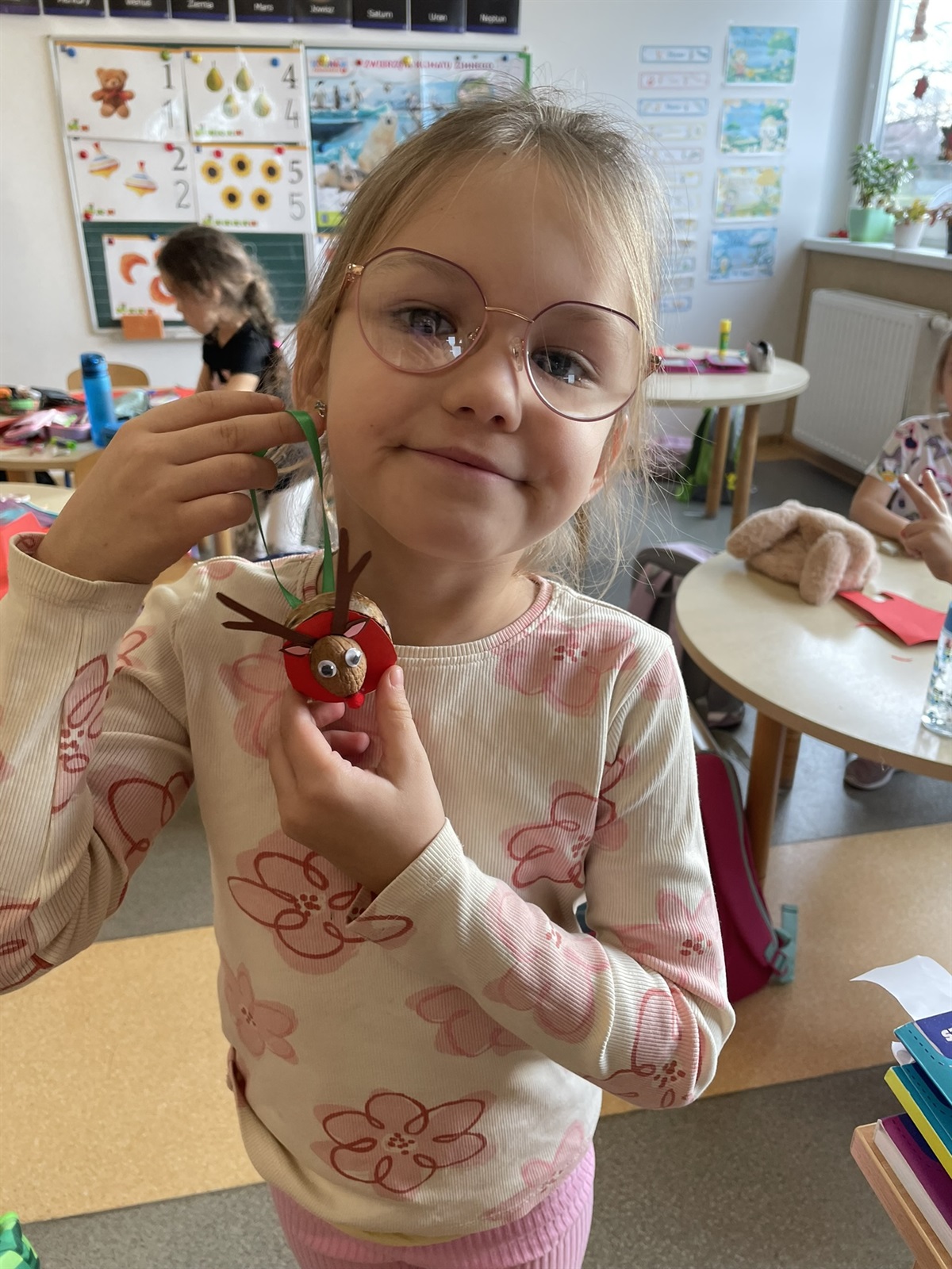 Nasi najmłodsi artyści pod czujnym okiem  swojej wychowawczyni stworzyli wyjątkowe ozdoby choinkowe. Duch świąt czuć już w całej naszej szkole, dlatego mali rękodzielnicy wykorzystując krążki brzozy, papier dekoracyjny, łupinki orzechów włoskich, sztuczne oczka, pompony