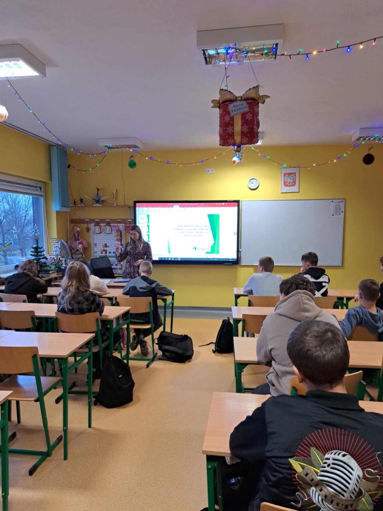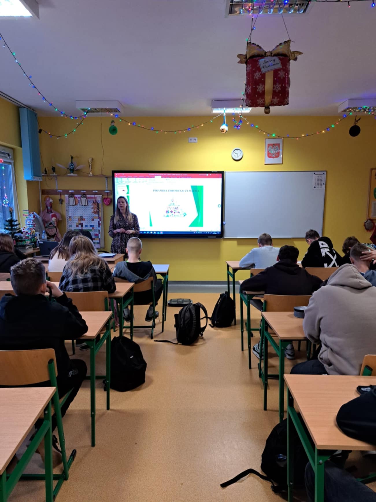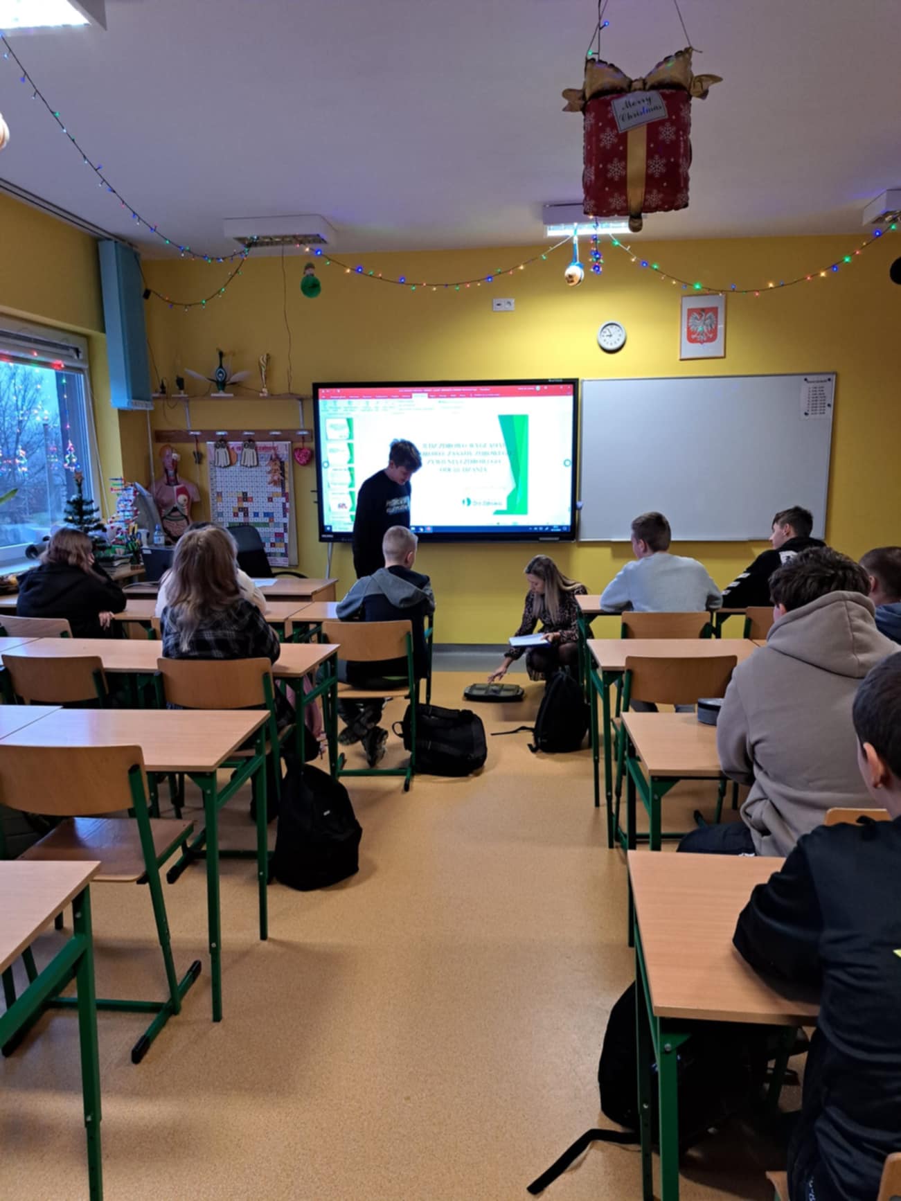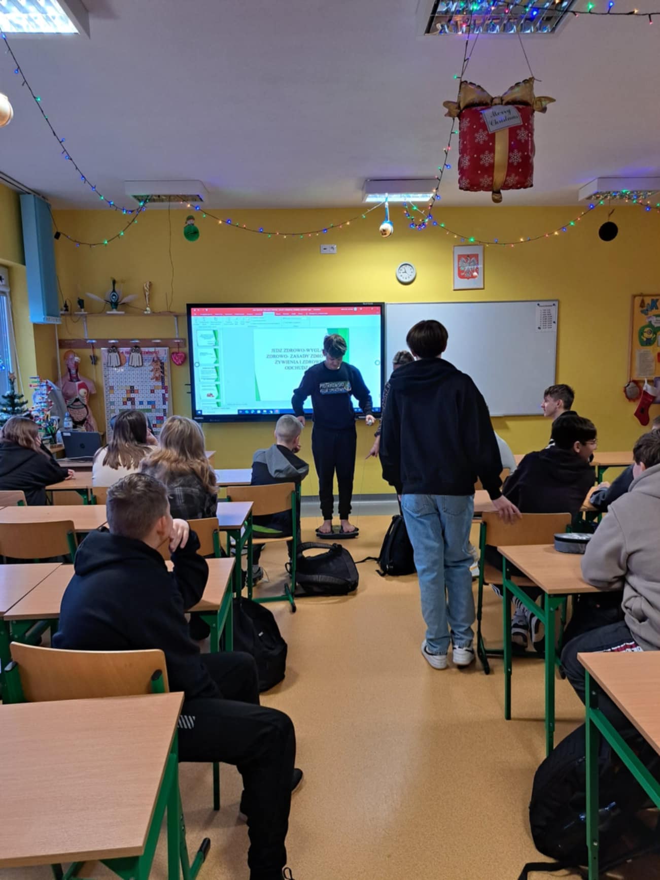 16 grudnia 2024 roku dla uczniów klas VII i VIII odbyło się wyjątkowe spotkanie z dietetykiem. Odwiedziła nas mgr Natalia Kudra z Poradni Dietetycznej Dla Zdrowia, która podzieliła się wiedzą na temat zasad zdrowego odżywiania i jego wpływu na nasze zdrowie. Podczas wydarzenia uczniowie dowiedzieli się m.in.: na czym polega praca dietetyka, jak komponować zbilansowane posiłki, dlaczego nawodnienie jest tak ważne, jak czytać piramidę zdrowego żywienia i aktywności fizycznej. Część praktyczna była szczególnie interesująca! Uczniowie mieli okazję dokonać analizy składu ciała za pomocą profesjonalnego analizatora, który dostarcza szczegółowych informacji o stanie zdrowia i kondycji fizycznej organizmu. Na zakończenie każdy otrzymał materiały edukacyjne. To było bardzo inspirujące spotkanie, które z pewnością zmotywuje nas wszystkich do dbania o swoje zdrowie!