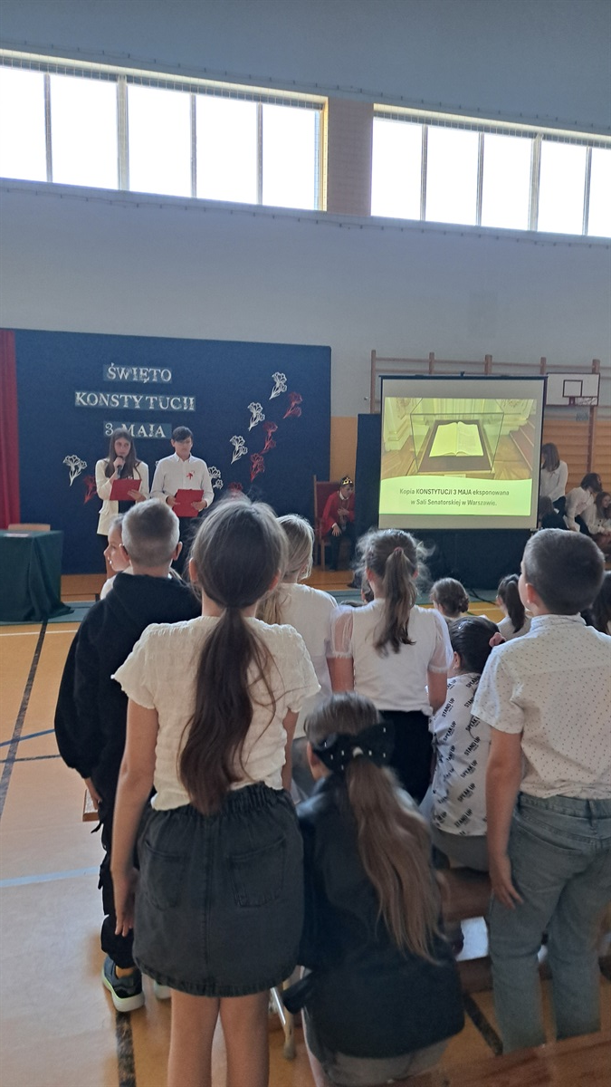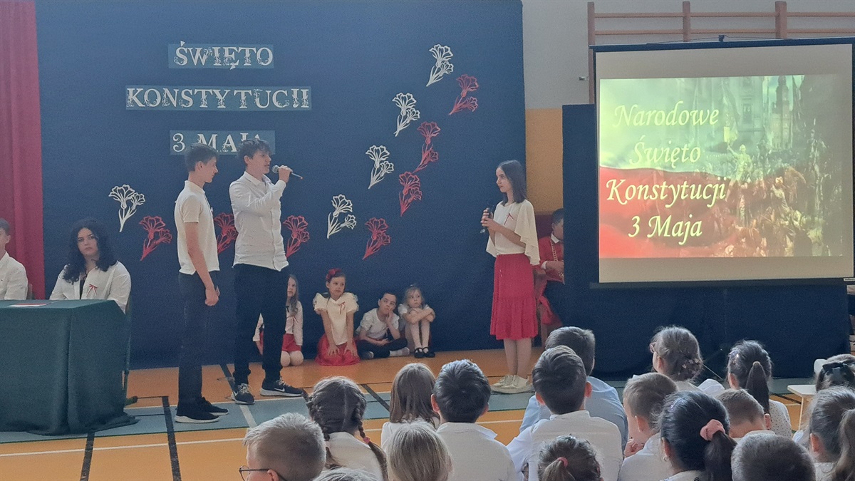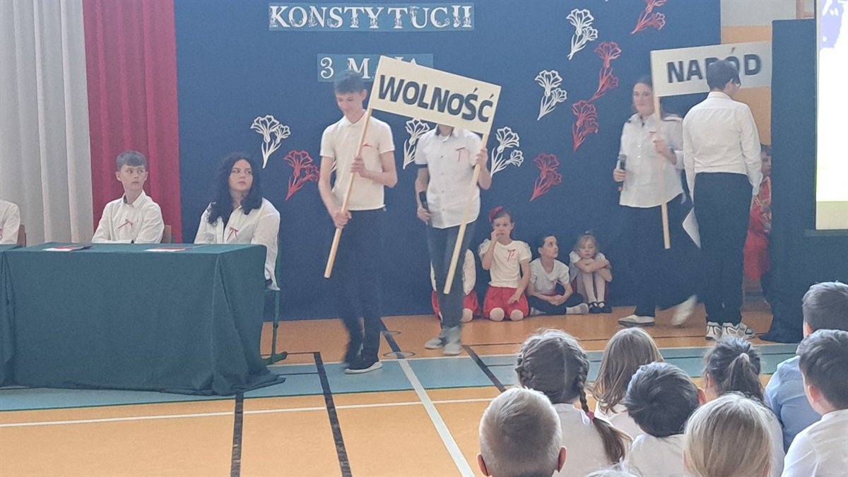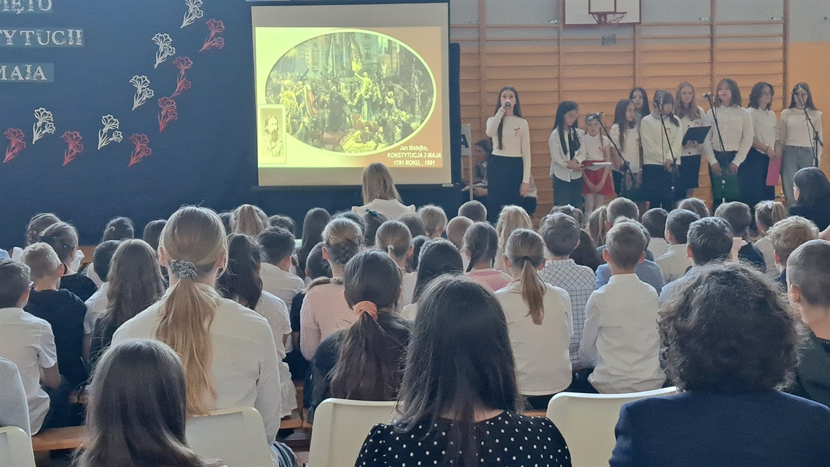 Z okazji 234. rocznicy uchwalenia Konstytucji 3 Maja w naszej szkole odbyła się uroczysta akademia, przygotowana przez uczniów klasy VII, członków koła teatralnego oraz szkolnego chóru. Wydarzenie było okazją do wspólnego uczczenia jednego z najważniejszych momentów w historii Polski oraz do refleksji nad wartością wolności, jedności i odpowiedzialności obywatelskiej. Uczniowie klasy VII zaprezentowali scenki historyczne, ukazujące okoliczności powstania pierwszej w Europie i drugiej na świecie konstytucji. Dzięki ich zaangażowaniu widzowie mogli przenieść się w czasy Sejmu Wielkiego i poczuć atmosferę przełomowych wydarzeń roku 1791. Oprawę artystyczną wydarzenia wzbogacili uczniowie koła teatralnego, którzy zadbali o oprawę taneczną oraz występ szkolnego chóru, który wykonał pieśni patriotyczne. Muzyka wprowadziła wszystkich zgromadzonych w podniosły nastrój i podkreśliła wagę narodowego święta.
