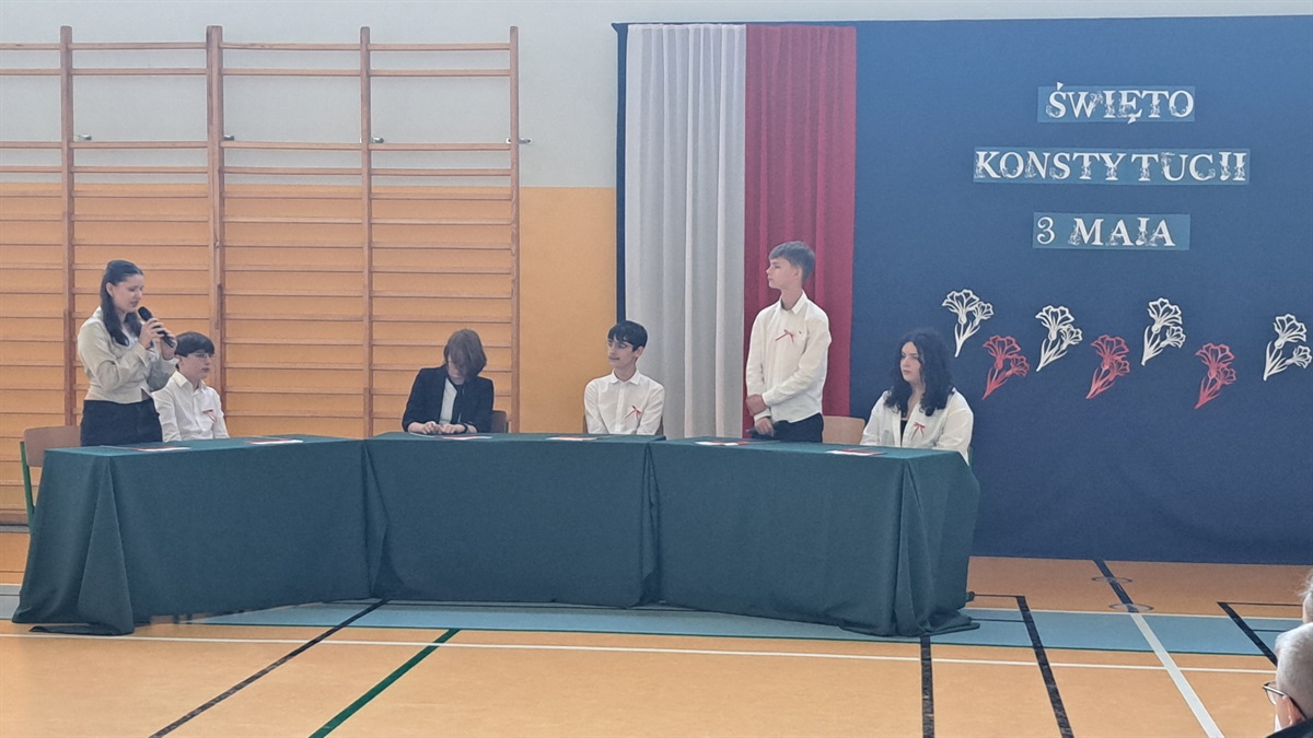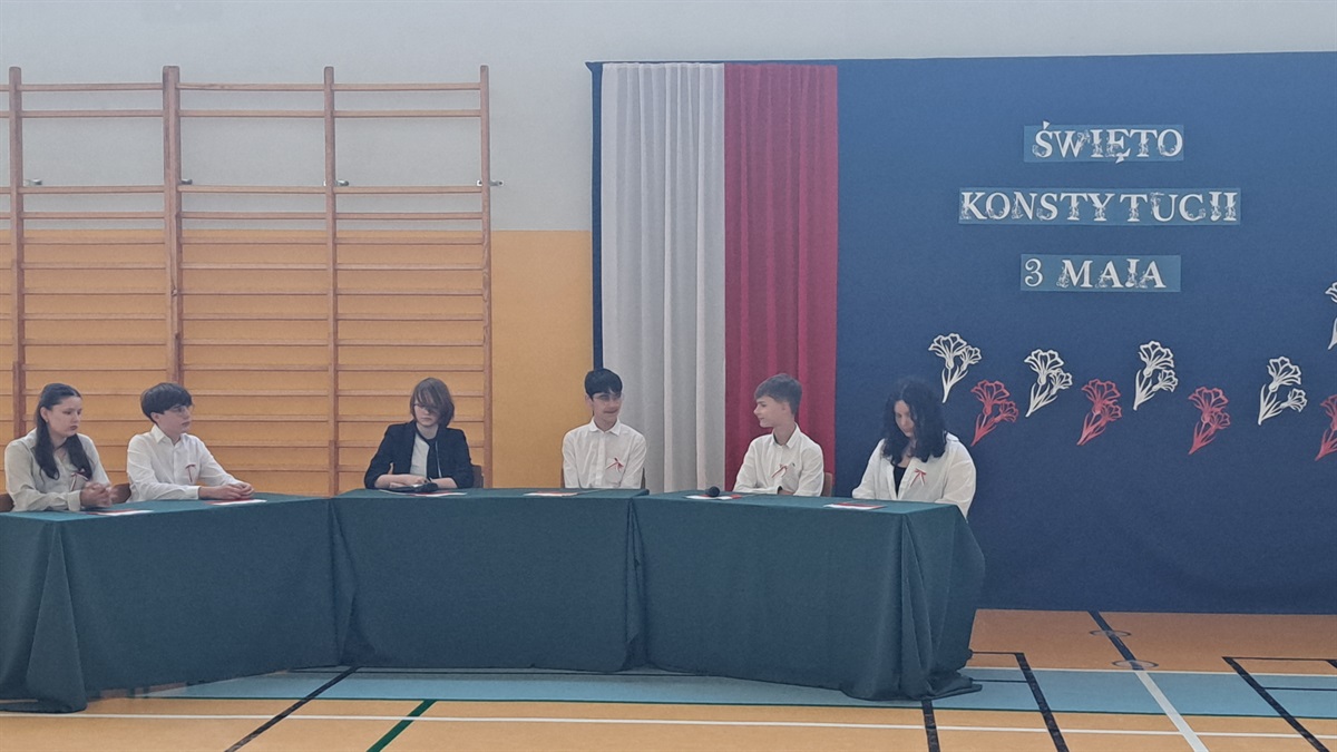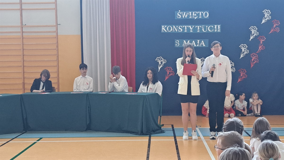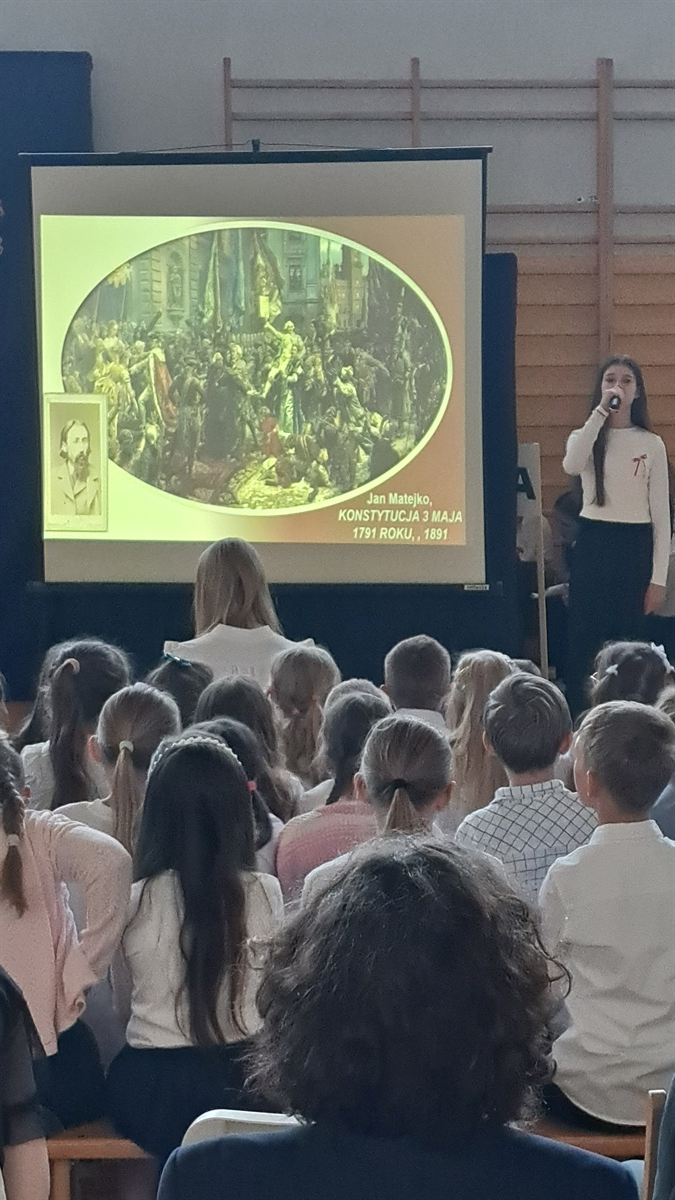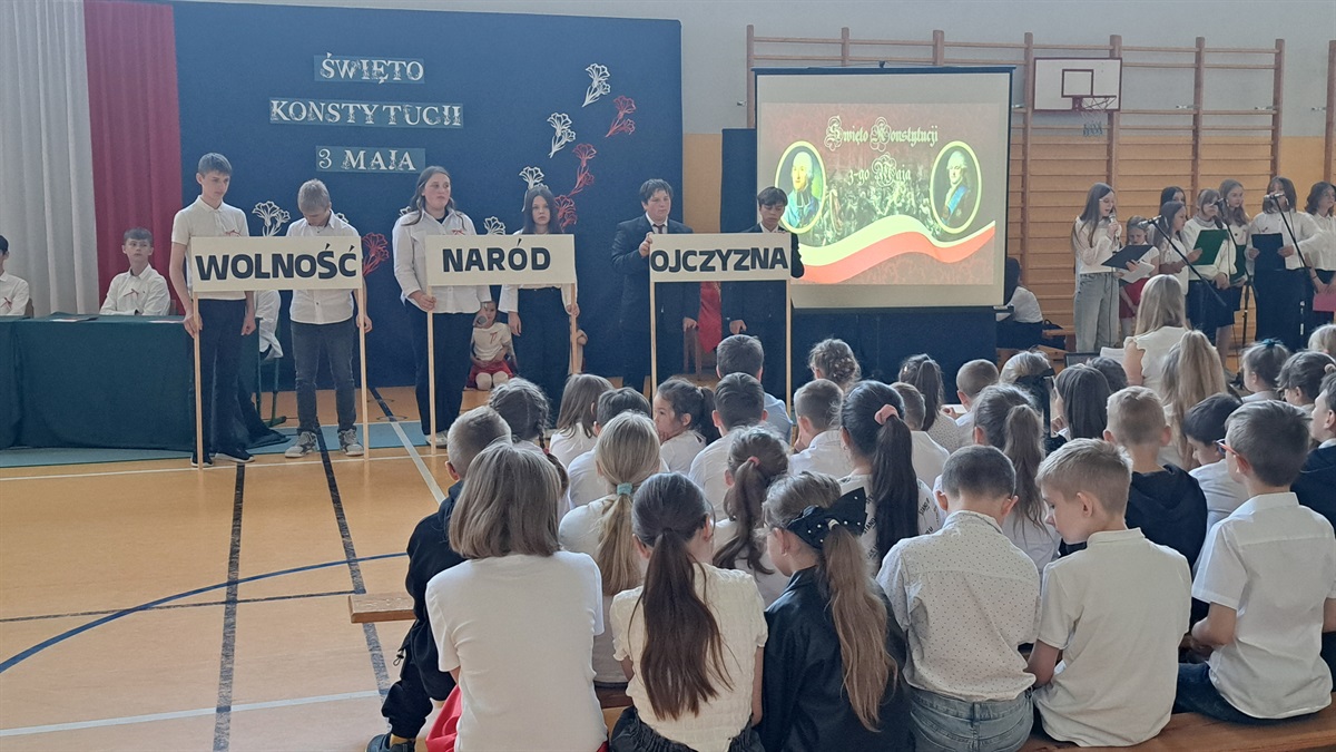 Z okazji 234. rocznicy uchwalenia Konstytucji 3 Maja w naszej szkole odbyła się uroczysta akademia, przygotowana przez uczniów klasy VII, członków koła teatralnego oraz szkolnego chóru. Wydarzenie było okazją do wspólnego uczczenia jednego z najważniejszych momentów w historii Polski oraz do refleksji nad wartością wolności, jedności i odpowiedzialności obywatelskiej. Uczniowie klasy VII zaprezentowali scenki historyczne, ukazujące okoliczności powstania pierwszej w Europie i drugiej na świecie konstytucji. Dzięki ich zaangażowaniu widzowie mogli przenieść się w czasy Sejmu Wielkiego i poczuć atmosferę przełomowych wydarzeń roku 1791. Oprawę artystyczną wydarzenia wzbogacili uczniowie koła teatralnego, którzy zadbali o oprawę taneczną oraz występ szkolnego chóru, który wykonał pieśni patriotyczne. Muzyka wprowadziła wszystkich zgromadzonych w podniosły nastrój i podkreśliła wagę narodowego święta.