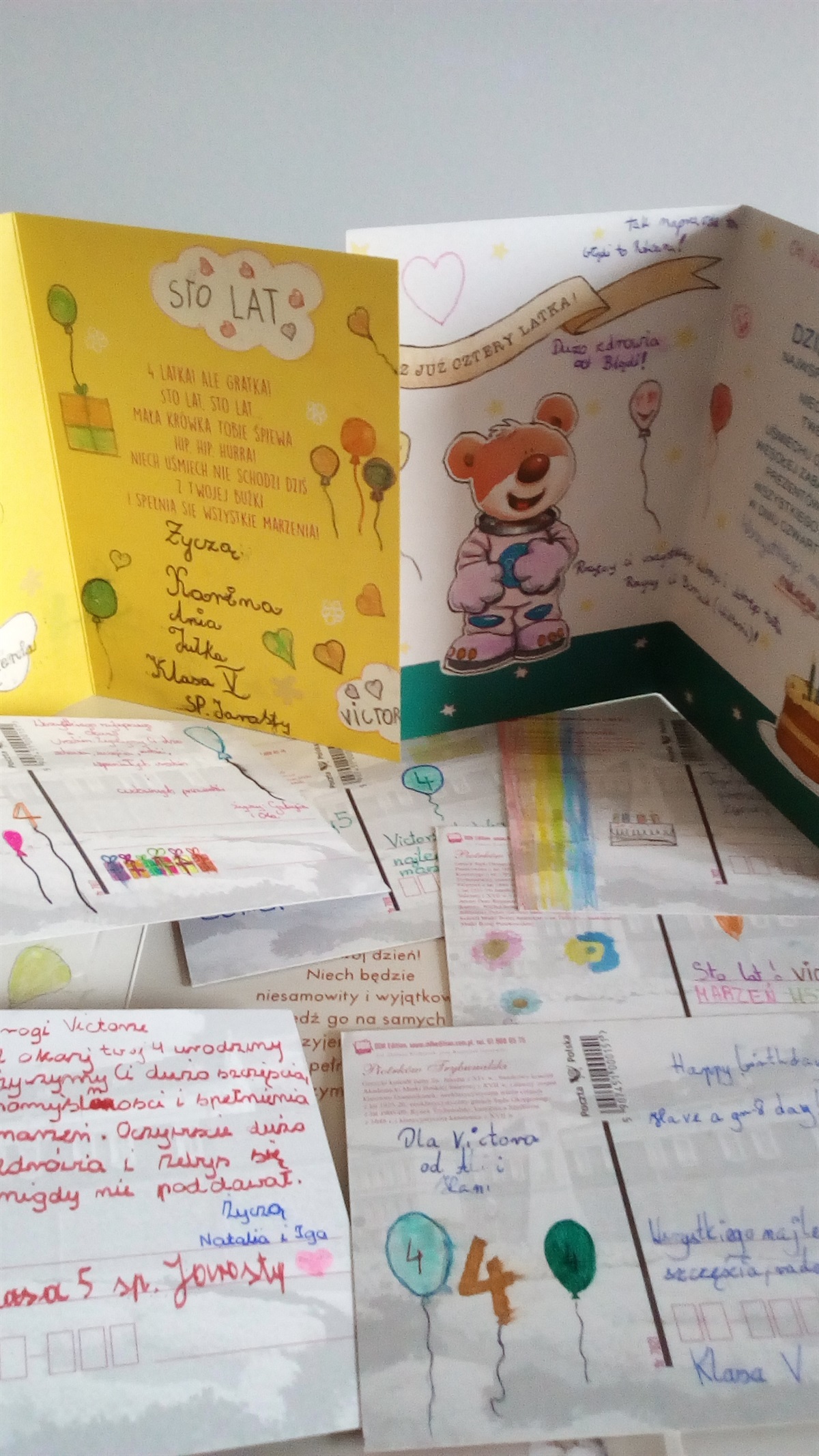 Szkolny Klub Wolontariatu włączył uczniów klasy V w akcję "Życzenia urodzinowe dla Victora". Victor to niepełnosprawny chłopczyk, który w grudniu obchodzi swoje 4 urodziny. Z tej okazji postanowiliśmy wysłać do niego kartki z życzeniami urodzinowymi. Zgodnie z prośbą jego mamy, na części pocztówek widniały zdjęcia Piotrkowa Trybunalskiego, ale było też kilka kartek urodzinowych. Uczniowie klasy V dodatkowo je ozdobili i pokolorowali oraz złożyli młodszemu koledze najlepsze życzenia. Szkolny Klub Wolontariatu przesłał także kartkę z życzeniami świątecznymi dla Victora i jego mamy, w imieniu całej społeczności naszej szkoły.