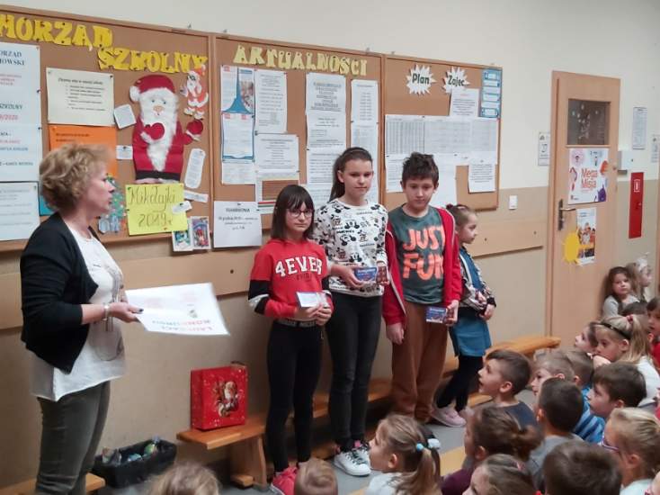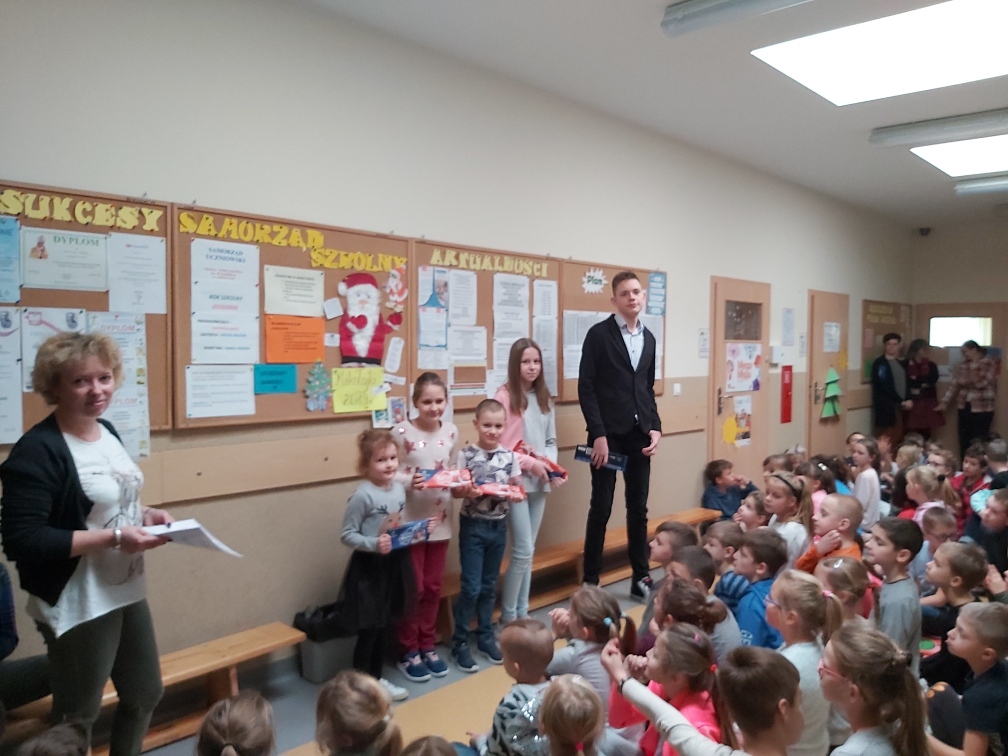 10 grudnia 2019 r. odbyło się w naszej szkole rozdanie nagród za konkurs pt."Najłdniejsza kartka świąteczna". Spośród bardzo dużej ilości przepięknie zrobionych kartek wybraliśmy 13. Nagrody otrzymali: Kacper Późniak kl.VIII, Natalia Gliszczyńska kl.VIB, Adam Trawiński kl.IV, Patryk Besztak kl.I, Zuzanna Mamełka kl. III, Martyna Dziubecka O.P. Przyznaliśmy również wyróżnienia, otrzymali je: Patrycja Dajcz kl. VII, Jakub Kromer kl.V, Anna Makowska O.P., Lena Dajcz kl.III, Daria Dajcz O.P., Damian Wieczorek kl. IV i Gabriela Dudek kl. V. Jak co roku najpiękniejsze kartki powędrowały do osób, które wspierają i pomagają naszej szkole , a pozostałe możemy podziwiać na gazetce szkolnej obok pracowni nr 39. Wszystkim uczestnikom serdecznie dziękuję i życzę zdrowych, radosnych i szczęśliwych Świąt Bożego Narodzenia. Organizatorem konkursu była p. Anna Strzopa-Machulska