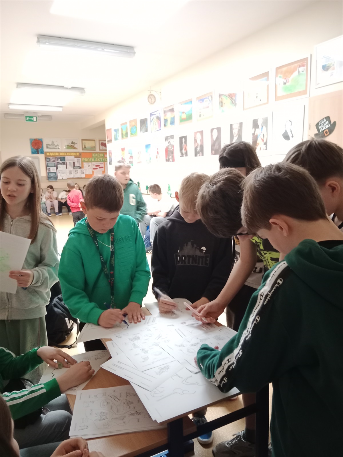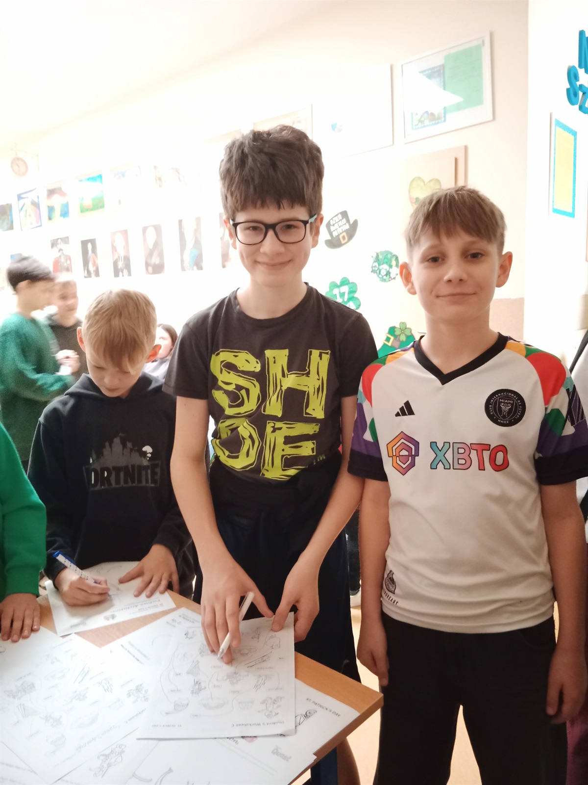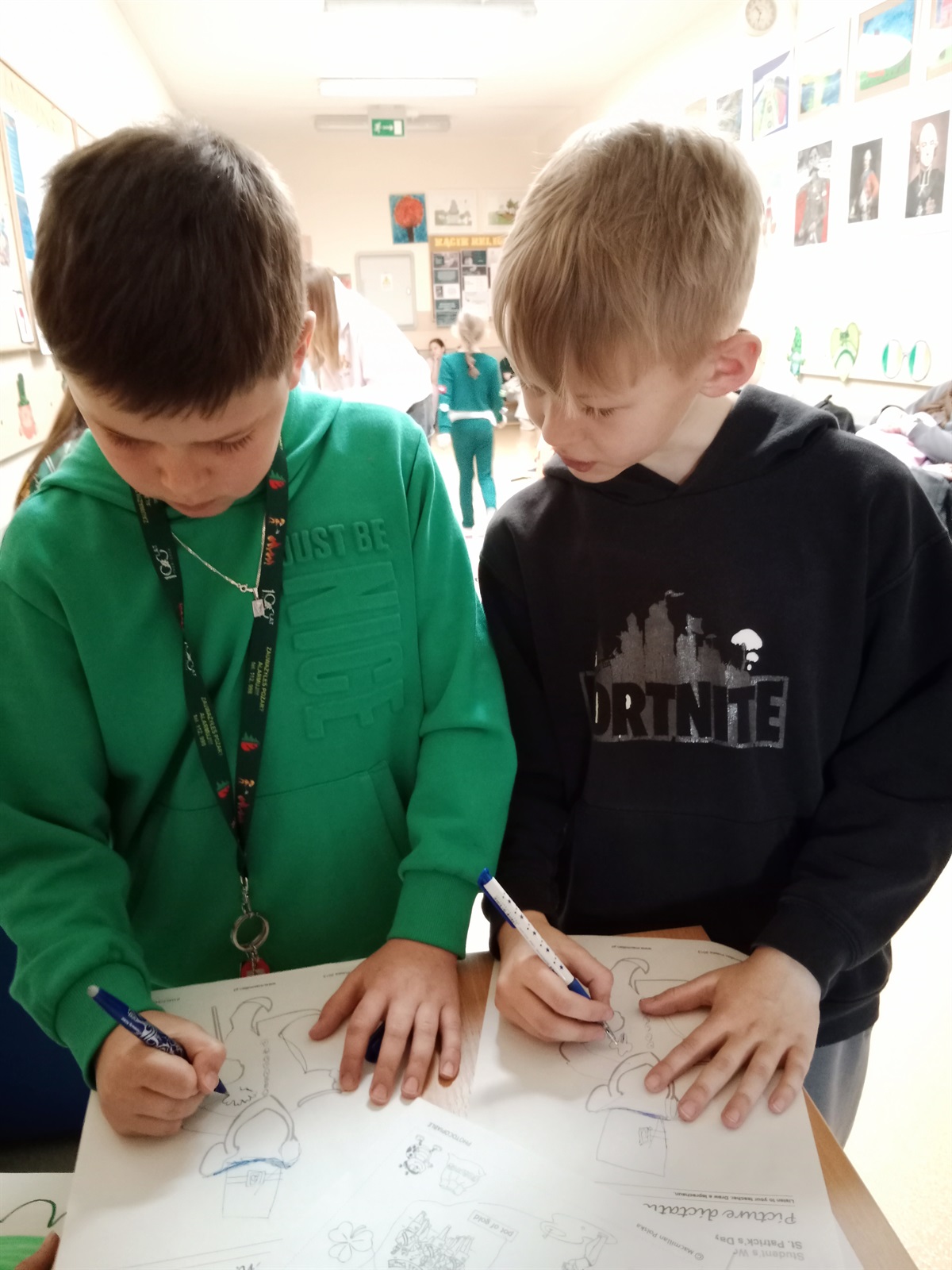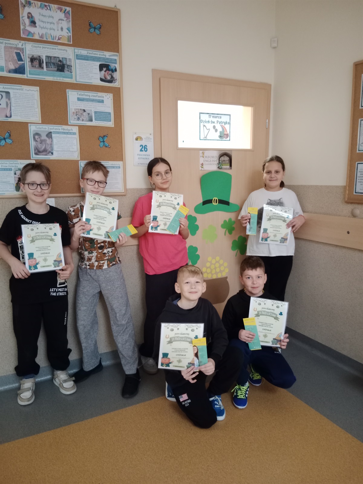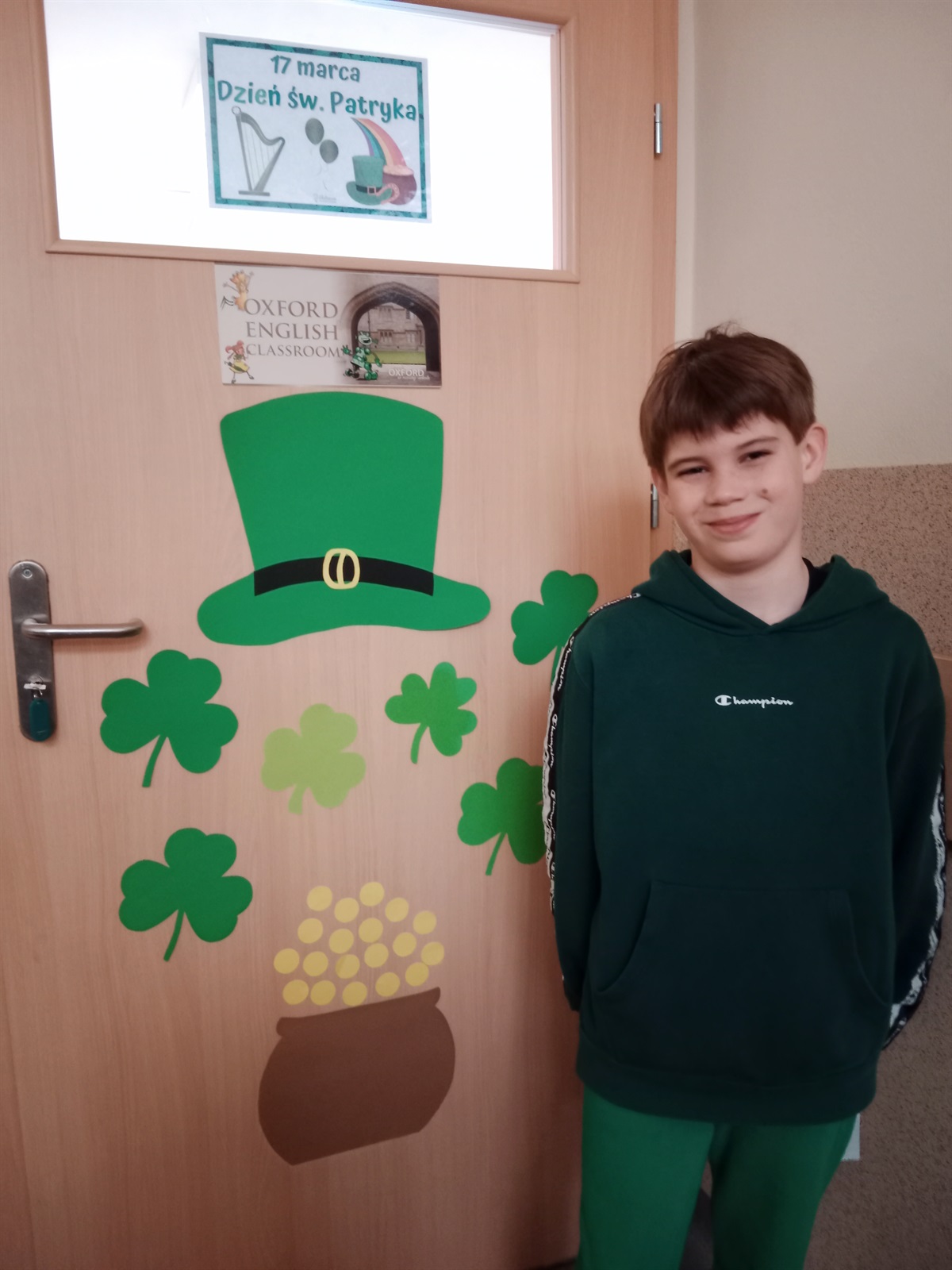 17 marca w naszej szkole odbyły się obchody Dnia Świętego Patryka. Na korytarzu szkolnym pojawiły się symbole związane z Irlandią, a kolor zielony znalazł się w  ubiorze niejednego ucznia. Każdy mógł włączyć się do zabawy rozwiązując zadania specjalnie przygotowane na ten dzień. Młodsi uczestnicy łączyli słowa z rysunkami, dokańczali rysowanie postaci Leprechauna, koniczynki, tęczy i garnca złota. A do zadań starszych uczniów należały krzyżówki, uzupełnianie tekstów i udzielanie odpowiedzi na pytania. Nasi podopieczni chętnie pozowali do zdjęć w przygotowanej specjalnie z tej okazji fotobudce. Za udział w zabawie rozdano też pamiątkowe dyplomy.